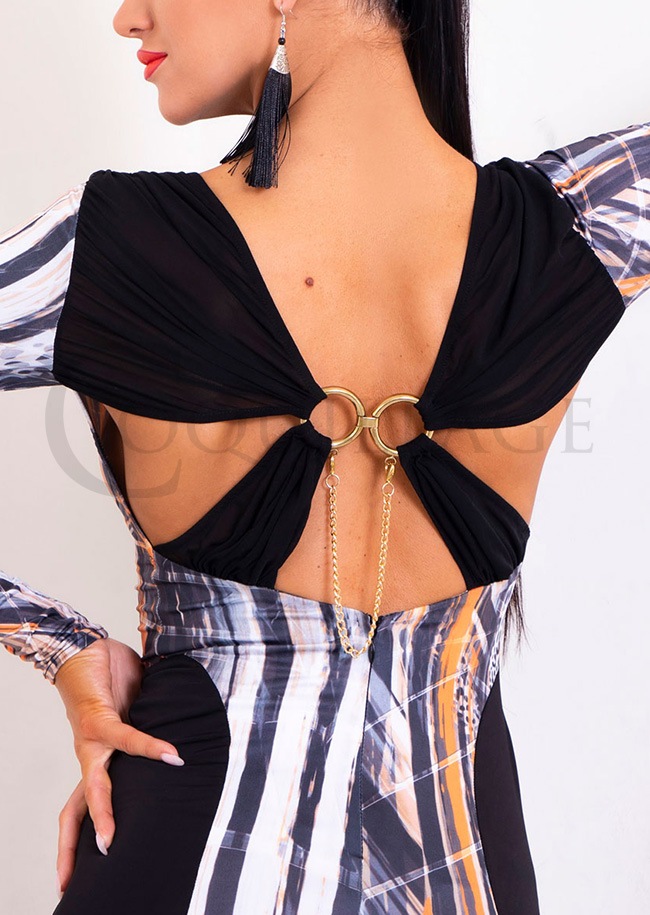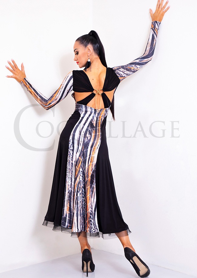 商品詳細背中の黒いドレープのデザインと、ゴールドのアクセサリーがグラマラスなロングドレス。 | |||||