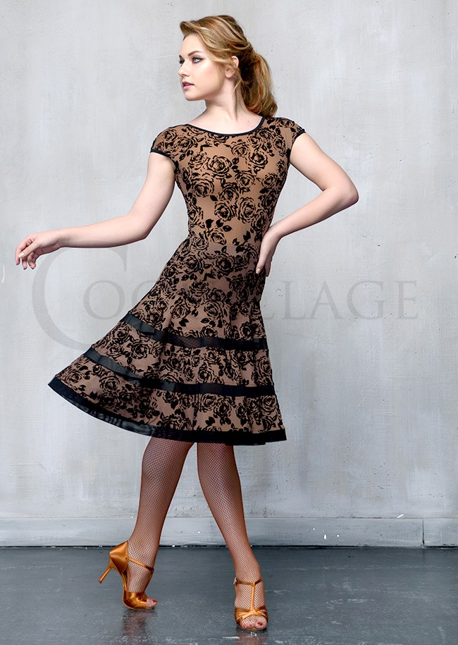 透け感のあるバラ柄のストレッチレースを使用したラウンドネックタイプのダンスレオタード。 *首回りがスッキリみえるデザインです。 *ボディ部分は裏地がついているので、透けにくい状態になっています。 *胸パッドはついておりません。