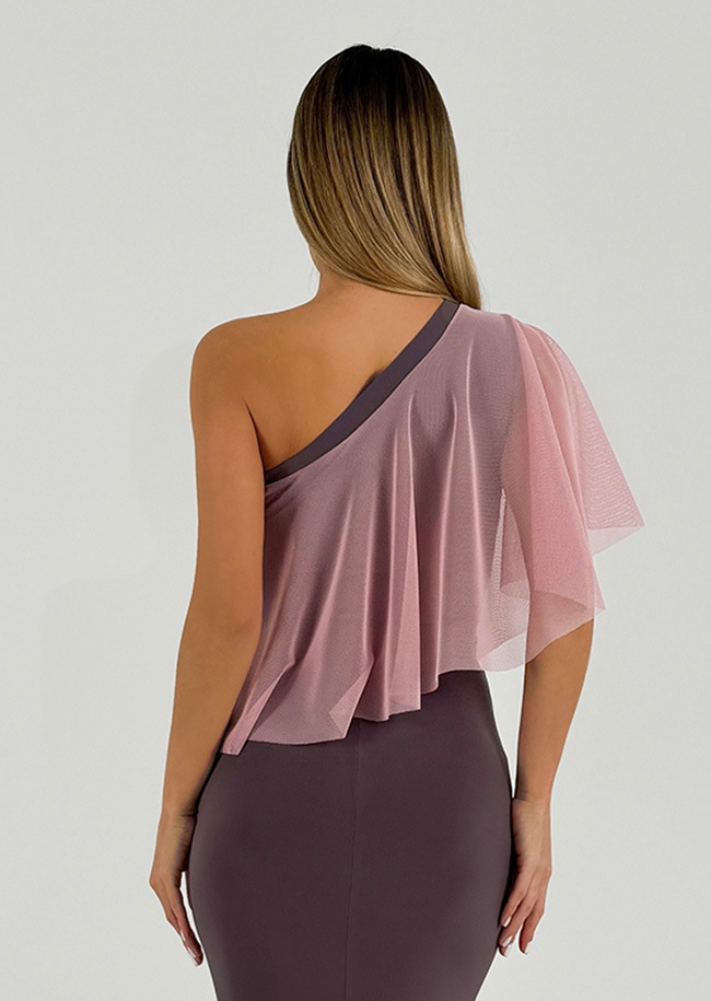 商品詳細片側の肩にソフトメッシュのフリルをあしらった、華やかなワンショルダー仕様のダンス用レオタード。 | ||||||||