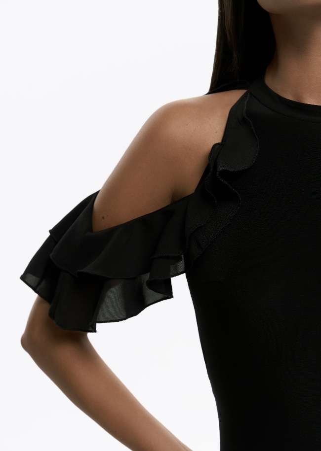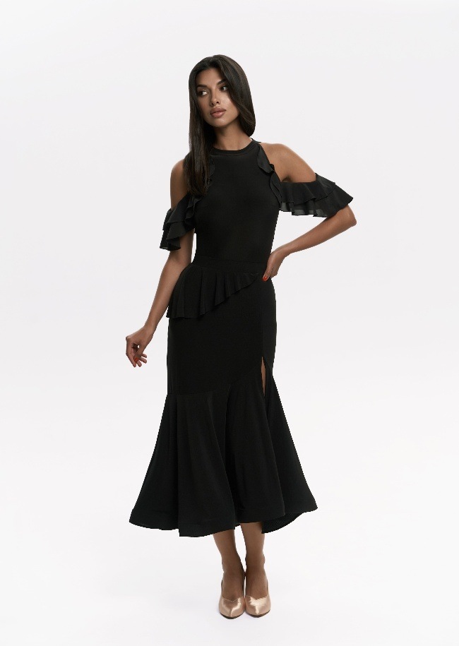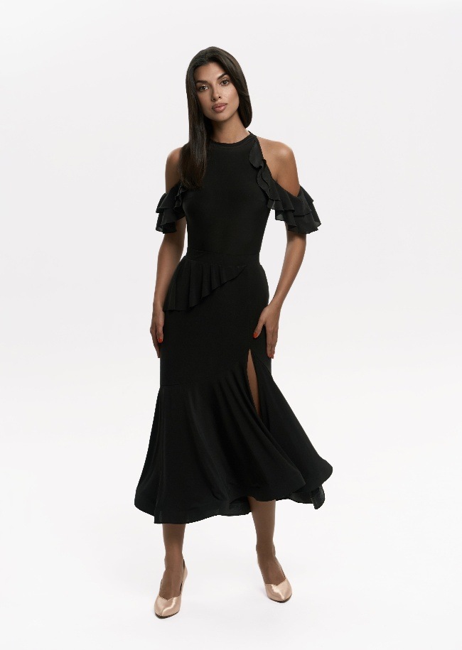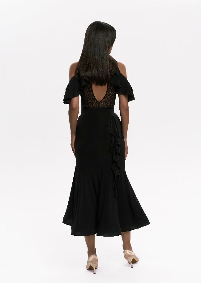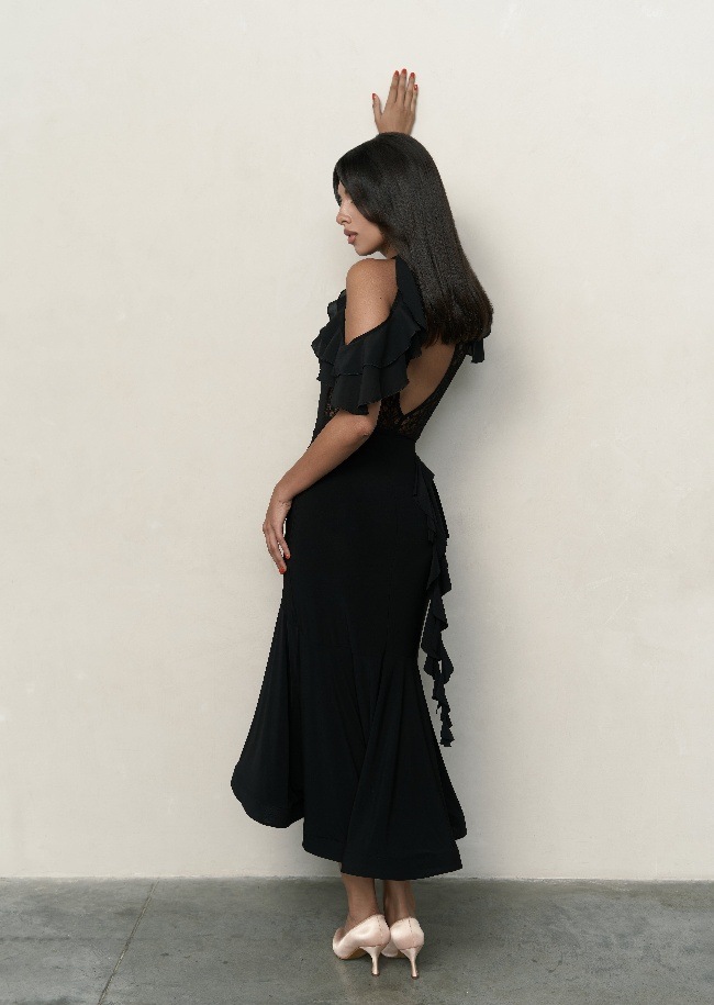 やわらかさの中に印象的な魅力を備えた「ポリー・ボディ」。肩にあしらわれたフリルがほどよい立体感を生み、背中のレースデザインがさりげない奥行きを添えます。女性らしさを大切にしながら、ダンスの場面でも日常でも美しく映える一着です。